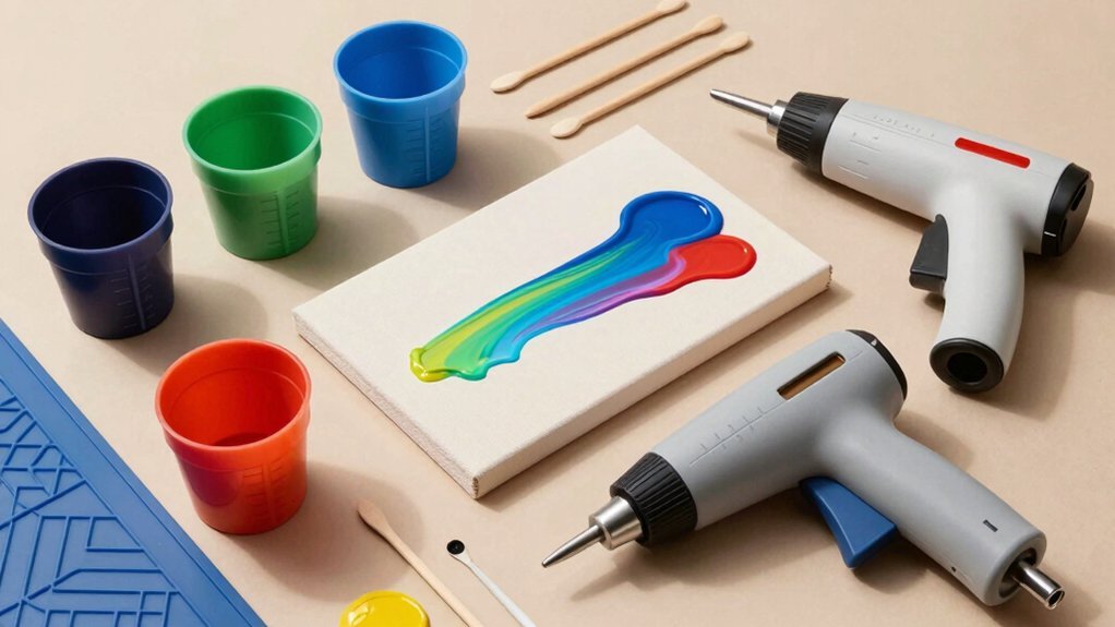 Beyond surface preparation, what you’ll actually use to pour matters just as much as what you’re pouring onto. You’ll want kits that bundle essential accessories like gloves, pipettes, and pouring oils—they streamline your workflow and expand your creative possibilities. Disposable tablecloths are game-changers for protecting your workspace and simplifying cleanup, letting you focus on art instead of mess management.