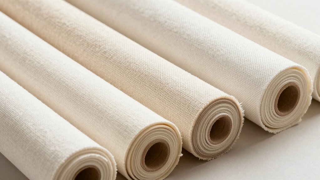Because the material you select fundamentally determines how your canvas performs and ages, you’ll want to prioritize 100% cotton compositions for their superior texture and longevity. Cotton canvas delivers the rich surface quality that accommodates various painting techniques while resisting deterioration.