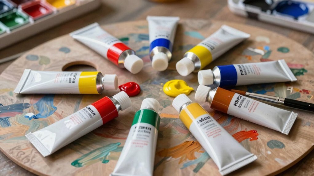 You’ll also appreciate how highly pigmented paints offer better coverage and blendability. Their oil-like texture grants you precise control when creating nuanced color mixes and gradients. Ultimately, investing in superior pigmentation secures your paintings maintain vibrancy and professional appearance for years.
