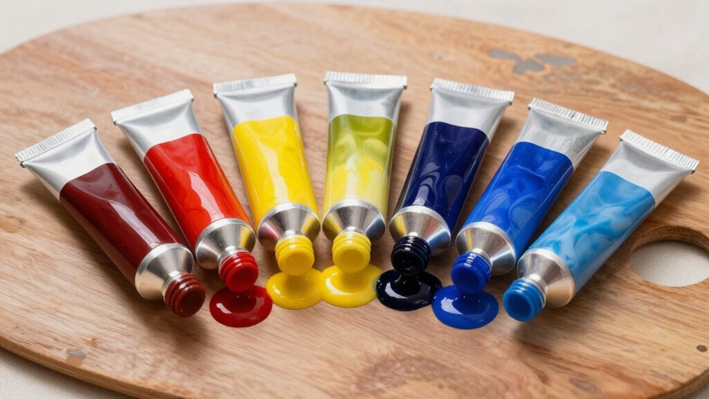 The consistency of your oil paint fundamentally determines how well you’ll blend and manipulate colors on the canvas during wet-on-wet work. You’ll want paints with a smooth, creamy, buttery texture that allows easy blending and manipulation. Avoid overly thick or stiff formulations, as they’ll resist your brushwork and prevent seamless color shifts.