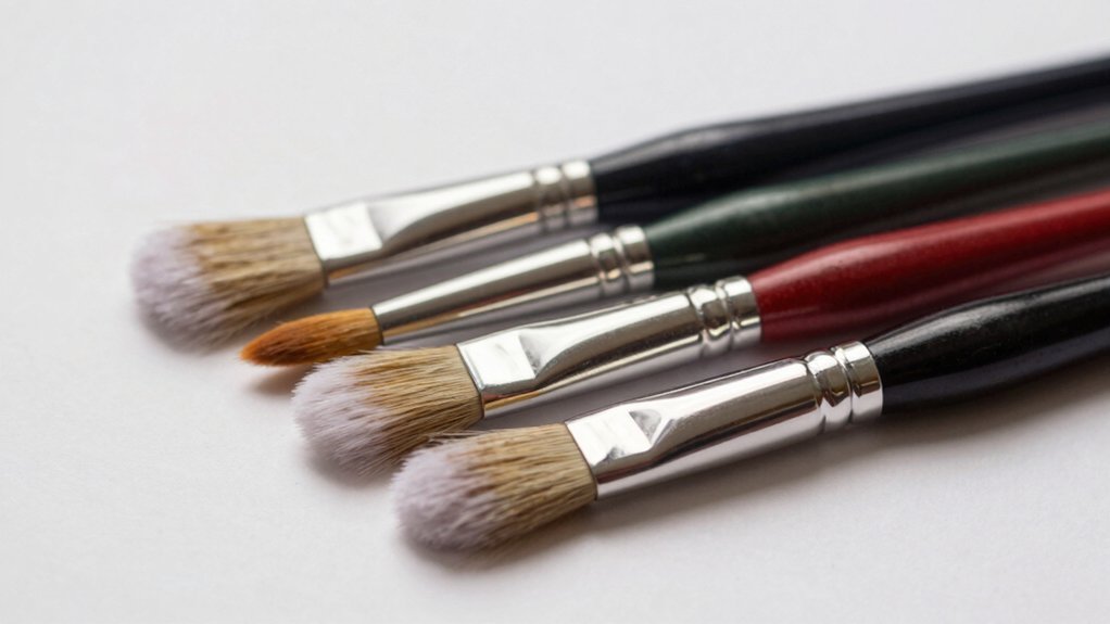 While handle comfort keeps you painting longer, the ferrule—the metal ring connecting bristles to handle—determines whether your brush will actually last. You’ll want to examine how the ferrule attaches to the handle; a secure connection prevents bristle loss during painting sessions.