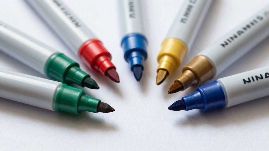 While surface preparation sets the foundation for your work, how quickly your markers dry and how long they last determines whether your finished pieces maintain their quality. Quick-drying formulas let you layer and overlap colors without smearing, giving you creative freedom and efficiency. You’ll appreciate water-based inks for their fade resistance—they retain vibrancy far longer than oil-based alternatives, ensuring your artwork stays vibrant for years. Many water-based markers become waterproof after drying, making them ideal for outdoor projects that face weather exposure. To maximize durability, store your markers capped or horizontally, which extends their usable lifespan considerably. By prioritizing drying speed and choosing fade-resistant formulas, you’ll create professional-quality work that stands the test of time.